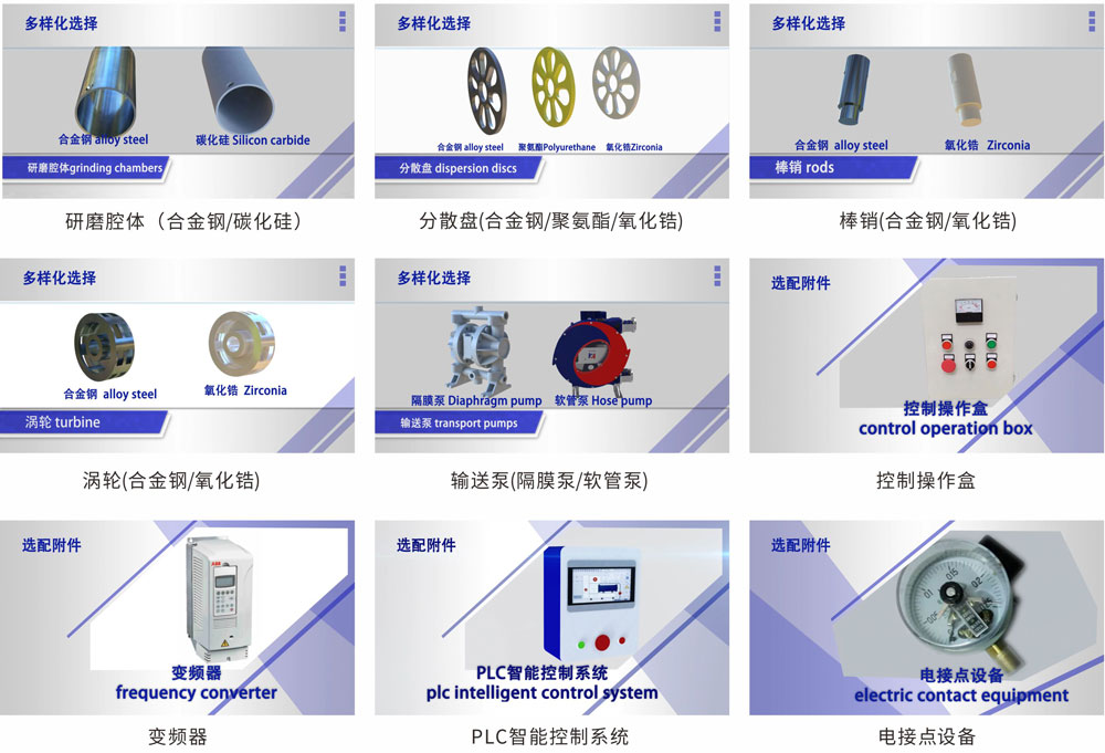 為保證產品的適應性,華運可提供不同材質的研磨腔體/分散盤/棒銷/渦輪/輸送泵等多樣化的選擇;提供控制操作盒、變頻器、PLC智能控制系統、電接點設備等選配附件。